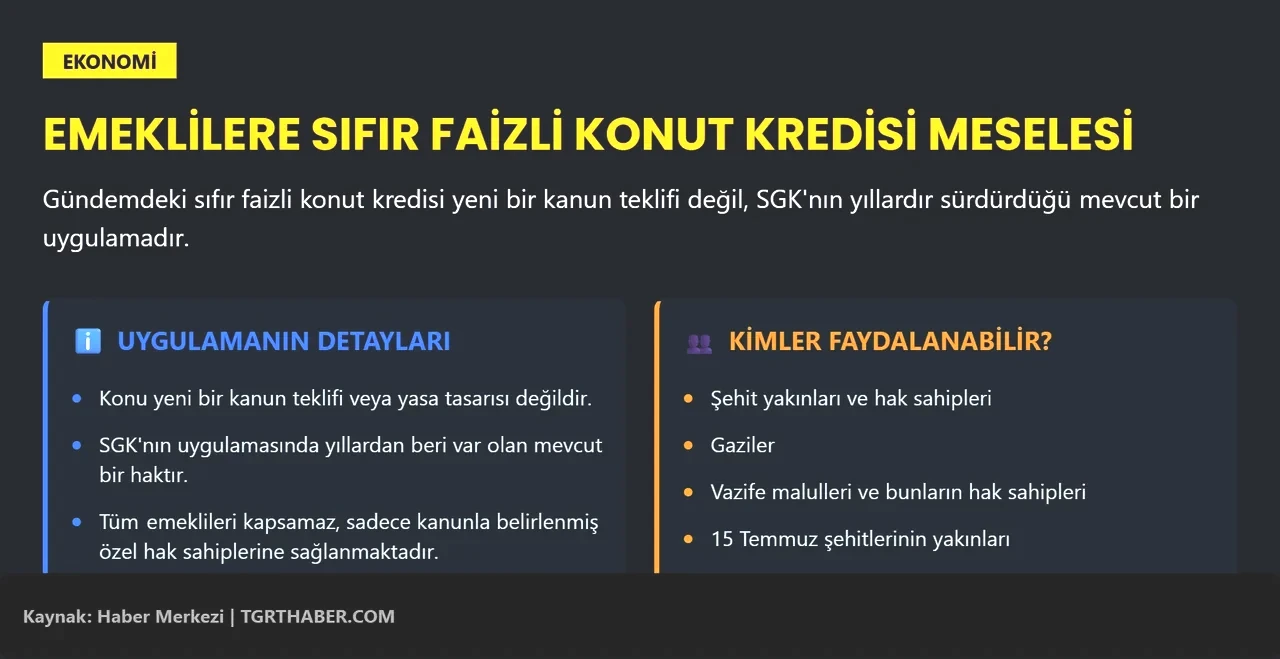Emeklilere sıfır faizli konut kredileri hakkında değerlendirme yapacak olursak, bu konuyu daha önce yazdığım gazetelerde de dile getirmiştim. Aslında bir uygulama zaten mevcut. Yani bu bir kanun teklifi değil, SGK'nın geçmişten gelen bir uygulaması. Öte yandan, kimlerin bu haklardan yararlanabileceğine baktığımızda, özellikle şehit ve gazi yakınları ile bunların hak sahipleri ve 15 Temmuz şehitlerine yönelik bir sıfır faizli konut kredisi imkânı olduğunu görüyoruz.